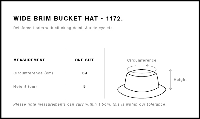 Reinforced large brim with stitching detail, side eyelets, self-fabric chin strap, plastic adjustable toggle